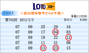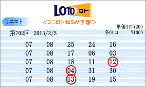| 2月5日の運命数は「7」と「8」です。該当数字は、「07」・「17」・「27」・「08」・「18」・「28」の6つです。チャートからの注意数字は、「05」・「07」・「08」・「12」・「13」・「18」・「21」・「25」となりました。ここから、今回の軸数字は、「07」と「08」を選択しました。「08」は2回出現していますが、「07」はまだ出現なし。それでも2012年は13回と出現上位の数字でした。 |