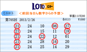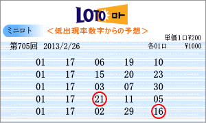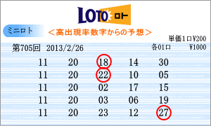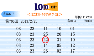 | 2月26日の運命数は、「9」と「3」です。該当数字は、「09」・「19」・「29」・「03」・「13」・「23」の6つ。チャートからの注意数字は、「01」・「02」・「03」・「12」・「17」・「20」・「22」・「23」が候補数字です。これらから705回の数字としては、「03」・「09」・「23」・「19」が浮上します。狙う数字として、今回は「03」と「23」を軸数字としました。 |