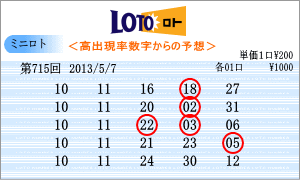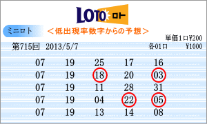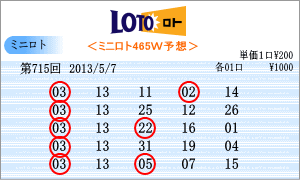 | 5月7日の運命数は、「7」と「3」。該当数字は「07」・「17」・「27」・「03」・「13」・「23」の6つの数字。出現チャートからの注意数字は、「07」・「11」・「13」・「15」・「19」・「20」など。直近の出現状況やチャートの状況から今回の軸数字は、「03」と「13」としました。5口の買い目はマシンの「ラッキー7」から導きだしました。 |