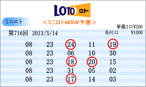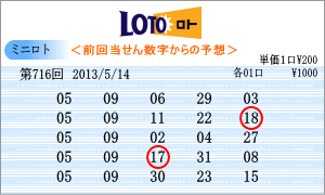 | 5月14日の運命数は、「8」と「3」です。「08」・「18」・「28」・「03」・「13」・「23」の6つの数字が対象です。715回は「7」と「3」でしたね。出現チャートからの注意数字は、「02」・「03」・「04」・「07」・「08」・「09」・「10」・「19」・「21」・「23」など。ここから、今回の軸数字は「08」と「23」を選びました。 |