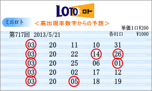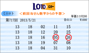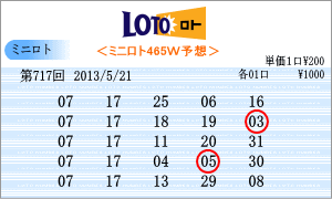 | 5月21日の運命数は、「7」・「4」・「5」の3つ。該当する数字は、「07」・「17」・「27」・「04」・「14」・「24」・「05」・「15」・「25」の9つの数字です。出現チャートからの注意数字は「07」・「08」・「09」・「16」・「17」・「18」・「23」・「24」・「25」など。これらから717回の軸数字は、「07」と「17」を選びました。 |