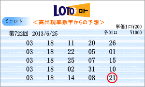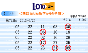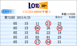 | 6月25日の運命数は、「1」と「5」です。該当数字は、「01」・「11」・「21」・「31」・「05」・「15」・「25」の7つです。チャートからの注意数字は、「02」・「03」・「05」・「11」・「13」・「14」・「15」・「18」・「21」です。運命数と注意数字から候補は「05」・「15」・「11」・「21」となりました。直近30回で上位の「05」と「15」を軸数字としました。 |