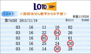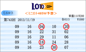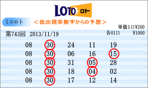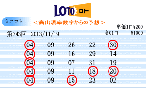 | 11月19日の運命数は「6」と「9」です。該当数字は、「06」・「16」・「26」・「09」・「19」・「29」の6つです。チャートからの注意数字は、「02」・「03」・「06」・「08」・「09」・「16」・「25」・「26」・「30」となりました。運命数と注意数字から「06」・「09」・「16」・「26」が候補となります。743回は「09」と「16」を軸数字としました。 |