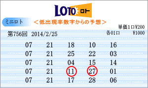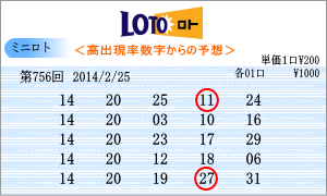 | 2月25日の運命数は「3」と「4」。該当する数字は、「03」・「13」・「23」・「04」・「14」・「24」の6つです。出現チャートからの注意数字は、「13」・「14」・「15」・「19」・「20」・「25」・「26」・「27」。候補としては、「13」・「23」・「04」・「24」の4つ。それぞれの出現回数や出現間隔から「13」と「23」を軸数字としました。 |