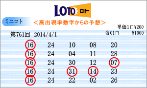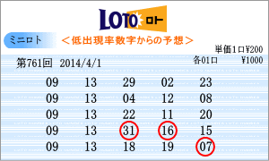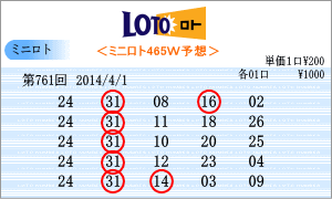 | 4月1日の運命数は、「1」と「4」です。「01」・「11」・「21」・「31」・「04」・「14」・「24」の7つが該当数字です。出現チャートからの注意数字は、「02」・「03」・「04」・「11」・「12」・「13」・「16」・「24」・「25」・「26」です。運命数の軸候補は、「11」・「31」・「14」・「24」の4つ。この中から今回の軸数字は「24」と「31」を選びました。 |