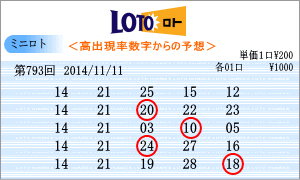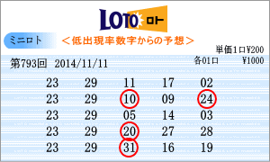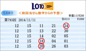 | 11月11日の予測範囲は、「04」・「08」・「10」・「12」・「13」・「14」・「15」・「16」・「20」・「21」・「22」・「23」・「29」と絞ってみました。連続候補は、「12」と「15」を軸数字に。高確率は、12回の「14」と「21」を軸数字に。低確率は、4回の「23」と5回の「29」を軸数字としました。結果的に数字が集まっている10番から20番台の始めの方になりました。 |