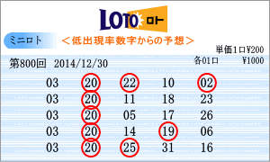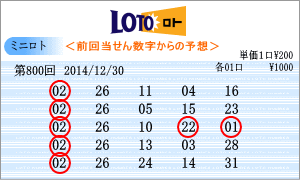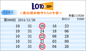 | 12月30日はちょうど800回という抽せん回になりました。予測範囲は、「01」・「02」・「03」・「10」・「14」・「15」・「16」・「18」・「19」・「20」・「25」・「26」・「27」・「31」となりました。連続候補は、「02」と「26」を軸数字に。このコンビは過去24回出現しています。高確率は、今年の出現回数15回でトップの「10」と「31」を軸数字に。このコンビは33回出現しています。低確率は、7回の「03」と9回の「20」を軸数字に。このコンビは過去23回出現しています。 |