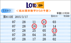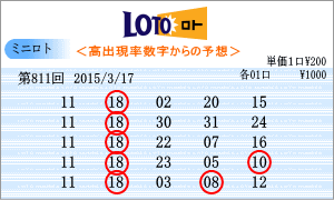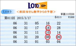 | 3月17日の予測範囲は、「01」・「05」・「06」・「07」・「11」・「12」・「13」・「14」・「15」・「18」・「19」・「28」・「30」・「31」となりました。連続候補は、「06」と「31」を軸数字に。このコンビは過去33回出現しています。高確率は、ベスト数字1位の「11」と4位の「18」を軸数字に。この「11」・「18」のコンビは41回出現していて465組の中で2位です。低確率は、ワースト数字5位の「07」と今年1回の「28」を軸数字に。このコンビは過去19回出現しています。5口の買い目は、ミニロトパーフェクトデータの最新相性数字で組み立てました。 |