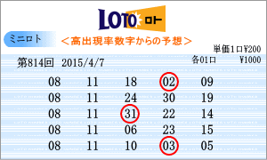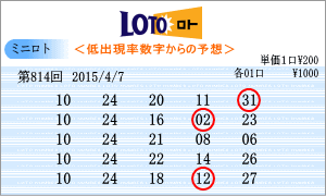 | 4月7日の運命数は「5」・「6」です。該当数字は、「05」・「15」・「25」・「06」・「16」・「26」の6つの数字です。出現チャートからの注意数字は、「02」・「05」・「06」・「07」・「08」・「11」・「12」・「13」・「16」・「18」・「20」・「21」となりました。この中から今回の軸数字は「05」と「16」を選びました。「05・16」は過去27回出現しています。 |