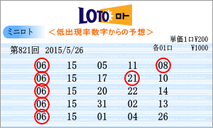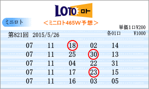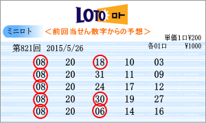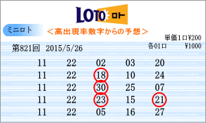 | 5月26日の運命数は、「1」と「7」です。該当数字は、「01」・「11」・「21」・「31」・「07」・「17」・「27」の7つです。出現チャートからの注意数字は、「01」・「03」・「06」・「07」・「11」・「15」・「19」・「22」など。「01」・「11」・「07」・「27」の4つの中から821回の軸数字は「07」と「11」としました。「07・11」は465組の中で過去33回出現しています。465組のトップは「02・11」の42回です。 |