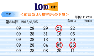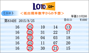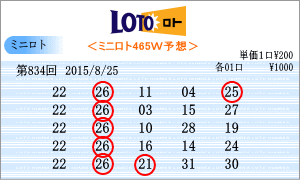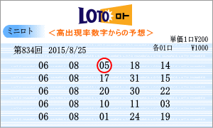 | 8月25日の予測範囲は、「06」・「08」・「09」・「10」・「11」・「14」・「16」・「19」・「22」・「25」・「26」・「28」・「30」・「31」となりました。連続数字としては、「09」と「28」を軸数字に。高確率は、12回の「08」と9回の「06」を軸数字に。低確率は、4回の「16」と「25」を軸数字としました。それぞれ5口の買い目を相性数字から組み立てました。 |