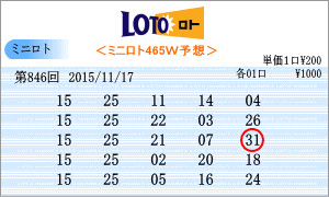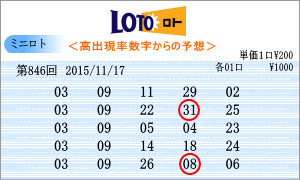 | 11月17日の運命数は、「3」・「2」・「5」の3つです。該当数字は、「03」・「13」・「23」・「02」・「12」・「22」・「05」・「15」・「25」の9つです。出現チャートからの注意数字は、「02」・「03」・「05」・「11」・「12」・「13」・「15」・「18」・「20」・「25」と運命数がかなり入っています。その中で、今回の軸数字は「15」と「25」を選びました。「15・25」の組み合わせは、過去29回出現で上位3分の1に位置しています。465組のトップは「02・11」の43回です。 |