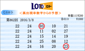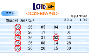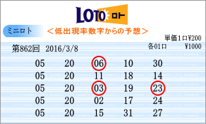 | 3月8日の運命数は「3」と「6」です。該当数字は、「03」・「13」・「23」・「06」・「16」・「26」の6つです。出現チャートからの注意数字は、「03」・「05」・「06」・「11」・「16」・「18」・「19」・「22」・「24」・「26」・「28」などです。「13」を除く運命数は斜線が成立しています。その中から軸数字は「06」と「26」を選びました。 |