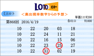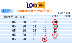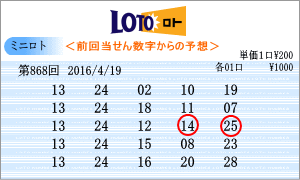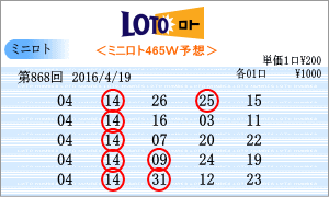 | 4月19日の運命数は「3」と「4」です。該当数字は、「03」・「13」・「23」・「04」・「14」・「24」の6つです。チャートからの注意数字は、「02」・「03」・「04」・「06」・「12」・「13」・「14」・「15」・「19」・「23」・「24」・「26」となりました。運命数がみな入ってきてます。前回の連続数字「23」・「24」も。今回はこの中から3回出現の「04」と2回出現の「14」を軸数字としました。 |