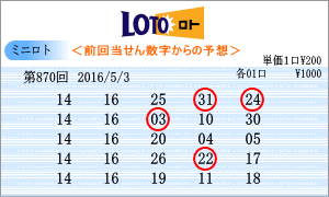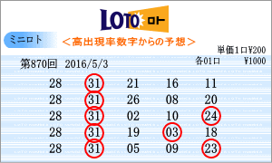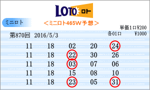 | 5月3日の予測範囲は、「01」・「03」・「08」・「11」・「12」・「13」・「14」・「15」・「16」・「18」・「20」・「21」・「22」・「26」・「28」・「31」となりました。連続候補は、「14」と「16」を軸数字に。高確率は7回でトップの「28」と6回の「31」を軸数字に。低確率は、1回の「12」と3回の「22」を軸数字として選びました。5口の買目は相性数字より組み立てました。 |