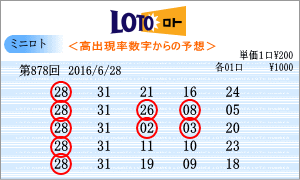 | 6月28日の予測範囲は、「01」・「03」・「07」・「08」・「12」・「13」・「14」・「15」・「17」・「21」・「22」・「24」・「28」・「29」・「31」となりました。連続数字は「14」と「22」を軸数字に。高確率は、9回でトップの「28」とそれを追う8回の「31」を軸数字に。低確率は、2回の「12」と3回の「01」を軸数字として選びました。 |