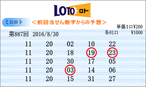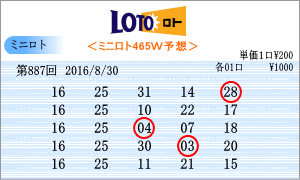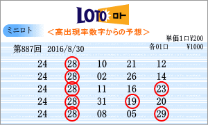 | 8月30日の予測範囲は、「05」・「06」・「10」・「11」・「12」・「14」・「16」・「19」・「20」・「21」・「22」・「24」・「25」・「28」・「30」となりました。まず886回からの連続数字は、「11」と「20」を軸数字に。高確率は、トップ10回出現の2つの数字「24」と「28」を軸数字に。低確率は、4回の「12」と5回の「06」を軸数字として選びました。ミニロトパーフェクトデータの最新相性数字での買い目を組み立てました。 |