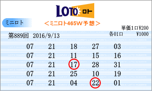 | 9月13日の運命数は「1」と「7」の2つ。該当数字は「01」・「11」・「21」・「31」・「07」・「17」・「27」の7つです。出現チャートからの注意数字は、「01」・「07」・「09」・「12」・「14」・「15」・「16」・「19」・「21」・「26」・「27」・「28」・「31」となりました。運命数がかぶっています。今回はこの中から7回の「07」と「21」を軸数字として選びました。「07・21」は465組の中で過去29回出現で中位の位置にいます。 |