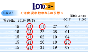 | 10月18日の運命数は「5」と「9」です。「05」・「15」・「25」・「09」・「19」・「29」の6つの数字が該当数字です。チャートからの注意数字は、「01」・「04」・「09」・「12」・「15」・「16」・「17」・「19」・「21」・「23」・「26」・「28」などです。運命数の「25」は前回出現していますし、「05」・「09」・「29」は斜線が成立しませんでした。消去法になりますが5回の「15」と7回の「19」を軸数字として選びました。 |