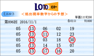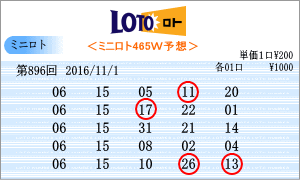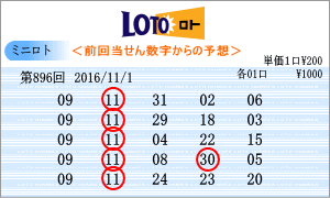 | 11月1日の予測範囲は、「03」・「05」・「06」・「09」・「10」・「11」・「12」・「13」・「15」・「17」・「19」・「21」・「23」・「24」・「30」となりました。連続数字は、4連続がかかる「11」と「09」を軸数字に。高確率は、ともに11回の「17」と「23」を軸数字に。低確率は、ともに5回という「05」と「13」を軸数字に選びました。895回の抽せん数字が偏っていたので、予測範囲も難しい選別でした。ミニロトパーフェクトデータから5口の買い目を組み立てました。 |