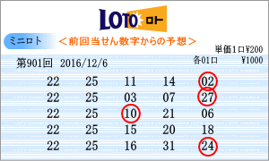 | 12月6日の予測数字は、「02」・「09」・「10」・「13」・「14」・「16」・「17」・「19」・「20」・「21」・「22」・「23」・「25」・「27」・「31」となりました。斜線成立数字が多くて絞り込みにこまりました。連続数字候補は、「22」と「25」を軸数字に。高確率は、15回でトップの「31」とそれを追う14回の「17」を軸数字に。低確率は、ともに6回という「13」と「20」を軸数字に選びました。最新相性数字からそれぞれ5口の買い目を組み立てました。 |