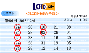 | 12月6日の運命数は「8」と「4」の2つです。該当数字は「08」・「18」・「28」・「04」・「14」・「24」の6つとなります。出現チャートからの注意数字は「03」・「04」・「08」・「10」・「13」・「14」・「16」・「20」・「23」・「24」・「27」・「28」となりました。運命数がそれなりに入ってきています。第901回の軸数字はこの中から13回出現の「24」と11回出現の「28」を選びました。5口の買い目はミニロトパーフェクトデータから組み立てました。 |