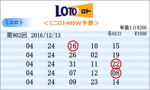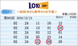 | 12月13日の運命数は、「4」・「7」・「8」の3つ。該当数字は、「04」・「14」・「24」・「07」・「17」・「27」・「08」・「18」・「28」の9つとなります。出現チャートからの注意数字は、「01」・「04」・「05」・「09」・「15」・「16」・「17」・「20」・「21」・「24」・「27」となりました。第902回の軸数字は、6回と少ないのですが「04」と14回とトップに迫る「24」を軸数字として選びました。5口の買い目はミニロトパーフェクトデータの相性数字で組み立てました。 |