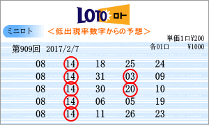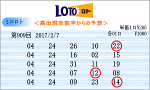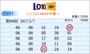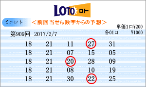 | 2月7日の予測数字は、「03」・「04」・「06」・「08」・「09」・「10」・「14」・「18」・「20」・「21」・「22」・「24」・「27」・「29」・「30」となりました。908回からの連続数字としては、連続出現回数40回の「18」と「21」を軸数字としました。高確率数字は3回でトップの「04」と「24」を軸数字に。低確率は、ともに0回という「08」と「14」を軸数字として選びました。5口の買い目はミニロトパーフェクトデータの相性数字から組み立てました。 |