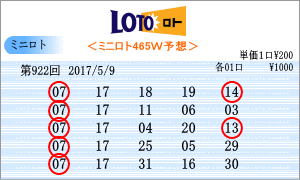 | 5月9日の運命数は、「9」と「7」です。該当数字は「09」・「19」・「29」・「07」・「17」・「27」の6つです。出現チャートからの注意数字は、「05」・「07」・「09」・「11」・「15」・「17」・「19」・「22」・「27」・「28」・「29」となりました。運命数がすべて入っています。「17」と「27」は5回出現、「09」と「07」が4回、「19」が3回、「29」が1回となっています。どれを選んでも出現しそうな感じですが、この中から「07」と「17」を軸数字として選びました。 |