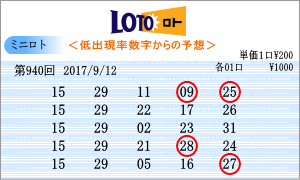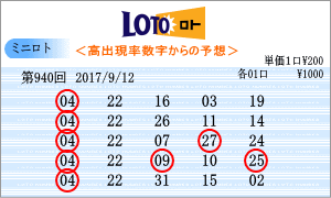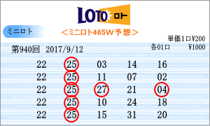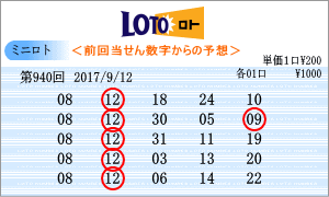 | 9月12日の予測数字は、「04」・「06」・「08」・「09」・「11」・「12」・「14」・「15」・「17」・「19」・「21」・「22」・「24」・「27」・「29」となりました。939回からの連続数字は、連続出現回数37回の「08」と26回の「12」を軸数字に。高確率数字は、14回でトップの「22」と10回という数字が4つあるのですが、その中から「04」を軸数字に。低確率数字は、4回の「29」、5回の「15」を軸数字として選びました。まだ3回という数字もあるのですが今回は入ってきませんでした。5口の買い目はミニロトパーフェクトデータの相性数字で組み立てました。 |
