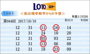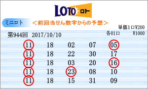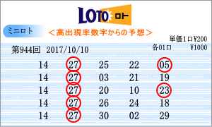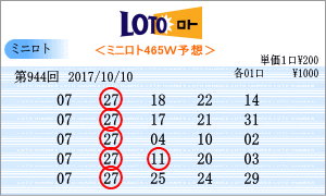 | 10月10日の運命数は「7」と「8」です。該当数字は「07」・「17」・「27」・「08」・「18」・「28」の6つです。出現チャートからの注意数字は、「05」・「07」・「08」・「11」・「12」・「14」・「17」・「22」・「27」・「28」となりました。「18」と「28」は前回の出現数字でもあります。この中から944回の軸数字は「07」と「27」を選びました。「07・27」の組み合わせは465組の中では過去27回と下位の方ですね。買い目は最新相性数字で組み立てました。2週連続的中を狙います。 |