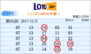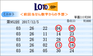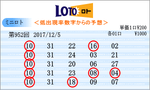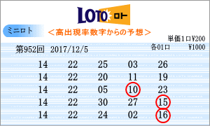 | 第952回の予測数字は、「03」・「05」・「06」・「07」・「08」・「10」・「11」・「13」・「14」・「22」・「24」・「26」・「28」・「31」となりました。連続数字は、連続出現回数が46回と上位の「03」と22回の「26」を軸数字に。高確率数字はトップ16回の「22」と12回の「14」を軸数字に。低確率数字は、5回の「31」と8回の「10」を軸数字として選びました。それぞれ5口の買い目はミニロトパーフェクトデータの最新相性数字でのものです。 |