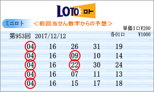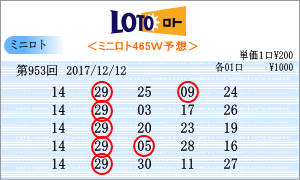 | 12月12日の第953回運命数は、「4」と「9」です。該当数字は「04」・「14」・「24」・「09」・「19」・「29」の6つです。出現チャートからの注意数字は、「04」・「05」・「07」・「09」・「11」・「13」・「14」・「17」・「21」・「23」・「25」・「29」となりました。運命数がかなり入っています。「04」は前回数字ですし、「04」・「19」は12回出現の数字でもあります。この中から今回の軸数字は「14」と「29」を選びました。 |
