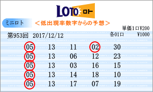 | 12月12日の予測数字は、「04」・「05」・「07」・「09」・「11」・「13」・「14」・「16」・「17」・「21」・「22」・「23」・「25」・「27」・「29」となりました。952回からの連続数字は、連続出現回数43回の「16」と35回の「04」を軸数字に。高確率数字は、トップ16回の「22」も予測数字に入りましたが、12回の「09」と「14」を軸数字に。低確率数字は、ともに9回という「05」と「13」を軸数字に選びました。ミニロトの抽せん回も年内あと3回となりました。 |