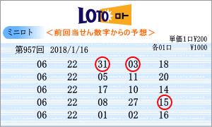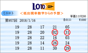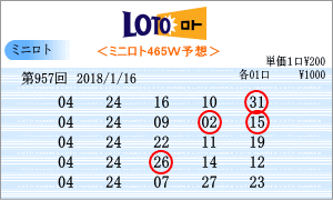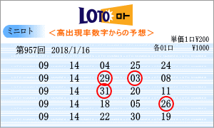 | 1月16日の第957回の運命数は、「4」と「8」です。「04」・「14」・「24」・「08」・「18」・「28」の6つの数字が該当数字です。出現チャートからの注意数字は、「03」・「04」・「06」・「08」・「09」・「14」・「18」・「22」・「24」・「28」などです。運命数それぞれがみな対象数字として入っています。そんないい条件が整った運命数の中から今回は「04」と「24」を軸数字として選びました。「04・24」の組み合わせは過去29回出現しています。全体では下位のほうの出現回数ですがそれでいいのです。 |