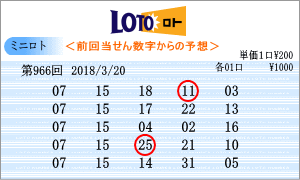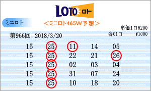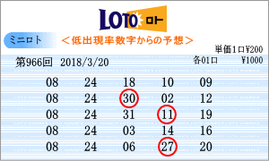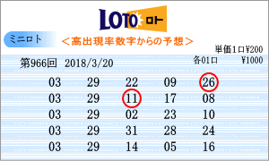 | 3月20日の予測数字は、「03」・「04」・「07」・「08」・「12」・「14」・「15」・「18」・「20」・「22」・「24」・「25」・「26」・「27」・「29」となりました。965回からの連続数字は、「15」と「07」を軸数字に。高確率数字は、6回トップの「03」と3回の「29」を軸数字に。低確率数字は、ともに0回という「08」と「24」を軸数字に選びました。ちなみに0回というのはこん2つ以外では「01」を残すのみとなりました。 |