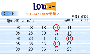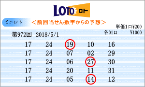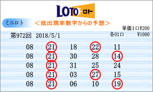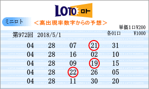 | 5月1日の予測数字は、「02」・「04」・「06」・「08」・「09」・「12」・「16」・「17」・「19」・「21」・「22」・「24」・「25」・「28」・「29」となりました。現在7回出現の「03」は斜線が成立しませんでした。前回からの連続数字は、「17」と「24」を軸数字に。高確率数字は、ともに4回の「04」と「28」を軸数字に。低確率数字は、いまだ0回の「08」と1回の「21」を軸数字として選びました。新しい「ミニロトパーフェクトデータVOL3」からの買い目です。 |