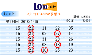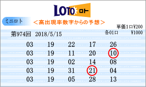 | 5月15日の第974回は運命数が「1」と「5」という組み合わせです。該当数字は、「01」・「11」・「21」・「31」・「05」・「15」・「25」となります。「11」はベスト数字1位で、「01」はワースト数字1位という面白い数字が揃いました。チャートからの注意数字は、「01」・「03」・「06」・「10」・「11」・「14」・「15」・「19」・「20」・「21」・「26」・「27」となりました。今回の軸数字は、この中から「15」と「21」を選びました。 |