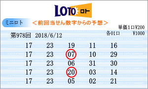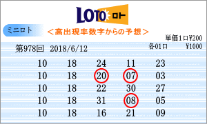 | ミニロトも1等が2000万円を超えるようになってきました。6月12日の予測数字は、「02」・「04」・「06」・「10」・「14」・「15」・「17」・「18」・「20」・「23」・「24」・「25」・「27」・「30」・「31」となりました。977回からの連続数字は「17」と「23」を軸数字に。高確率数字は、「10」と「18」を軸数字に。低確率数字は、2回という「06」と「25」を軸数字に選びました。 |