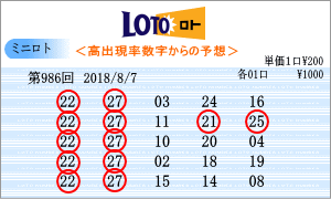 | 8月7日の第986回を狙う予測数字は、「02」・「04」・「05」・「06」・「07」・「09」・「12」・「15」・「16」・「18」・「22」・「25」・「27」・「29」・「30」となりました。985回からの連続数字は、「05」と「16」を軸数字に。ともに3回連続がかかっています。高確率数字は、トップ数字「27」と5回なんですが斜線成立のカタチから「22」を軸数字に。低確率数字は、同じ段数で斜線が交差した「09」と斜め出現の可能性から「25」を軸数字に選びました。それぞれ5口の買い目は相性数字で組み立てました。 |