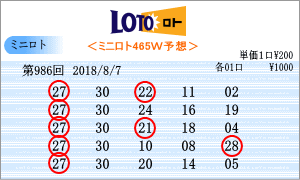| 8月7日の運命数は「7」・「6」・「0」の3つです。該当数字は、「07」・「17」・「27」・「06」・「16」・「26」・「10」・「20」・「30」の9つです。出現チャートでの注意数字は、「04」・「05」・「06」・「07」・「09」・「15」・「18」・「22」・「27」・「30」となりました。運命数が半分ほど注意数字に入ってきています。抽せん数字の分布表から見て、今回の軸数字は「27」と「30」を選びました。「27」は現在トップの数字で、「30」は現在6回という数字です。5口の買い目は相性数字での組み合わせです。 |