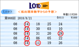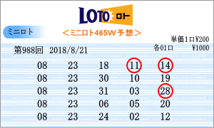 | 8月21日の第988回を狙う予測数字は、「03」・「04」・「05」・「08」・「14」・「15」・「16」・「18」・「20」・「21」・「23」・「27」・「28」・「30」・「31」となりました。987回からの連続数字は、「15」と「21」を軸数字に。高確率数字は、トップ数字「27」と8回の「03」を軸数字に。低確率数字は、4回の「08」と「14」を軸数字に選びました。それぞれ5口の買い目は相性数字で組み立てました。予測数字は31個の中から斜線成立数字をリストアップしています。5口の買い目は相性数字で組み立てています。 |