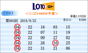 | 9月25日の運命数は「4」・「9」・「2」の3つです。該当数字は、「04」・「14」・「24」・「09」・「19」・「29」・「02」・「12」・「22」の9個です。出現チャートからの注意数字は、「02」・「03」・「06」・「12」・「14」・「19」・「20」・「22」・「27」・「29」となりました。運命数はほとんどが注意数字に入ってきています。分布表からの出現状況から見て、軸数字は「04」と「22」を選びました。「04・22」は465組の中では過去38回出現の上位コンビです。 |